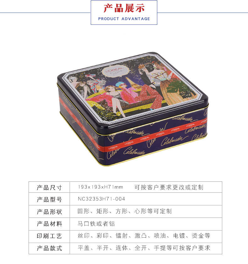- 型号:NC2604A-003 尺寸:155x108xH50mm 材质:马口铁 用途:金属化妆品盒